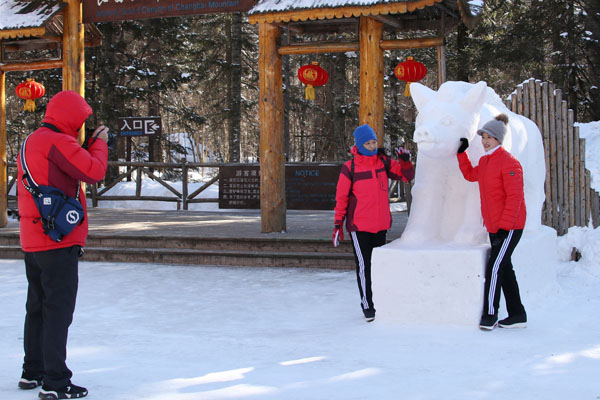 雪娃鬧春、福祿雙全、“豬”運亨通、花鼠送福等造型各異的雪雕作品,吸引眾多游客前來游玩,拍照合影。這些雪雕作品全部由公司員工自行設計并制作而成,他們起早貪黑,頂風冒雪,短短半月時間就打造出數種雪雕作品,不僅豐富和活躍了長白山冬季旅游,更為景區增添一抹亮麗的冰雪色彩。