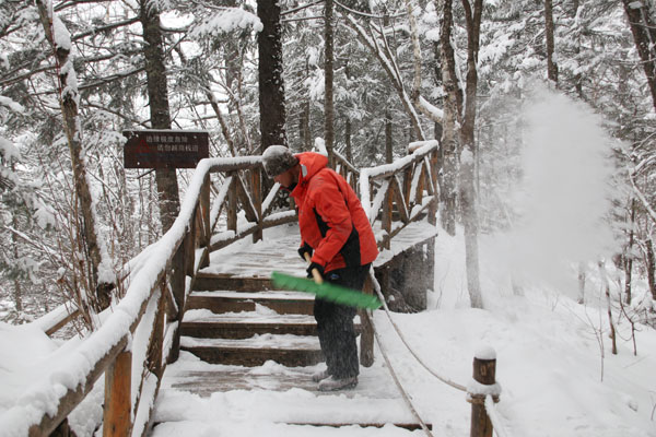 大年初一,長白山普降瑞雪,公路積雪厚度近50厘米,服務先鋒黨小組以雪為令,小組中以黨員為骨干的清雪防滑隊,凌晨就頂著星辰和寒風開始清雪除障作業,保證道路在山門開放前安全暢通達到開放要求,大家克服凜冽的寒風完成1800米棧道積雪清理工作。